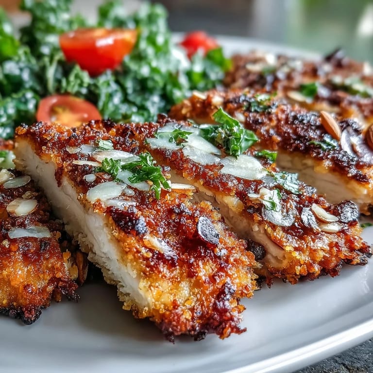 Pin There's a particular Tuesday afternoon that comes to mind whenever I make this dish—I was standing in my kitchen listening to rain tap against the window, feeling stuck between wanting something crispy and something bright, something that felt both indulgent and clean. That's when the almond crust clicked into place, golden and shattering under my fork, while the kale with its tart sumac punch seemed to balance everything out. It's become the meal I turn to when I want to feel like I've actually cooked something, without spending half my evening in front of the stove.