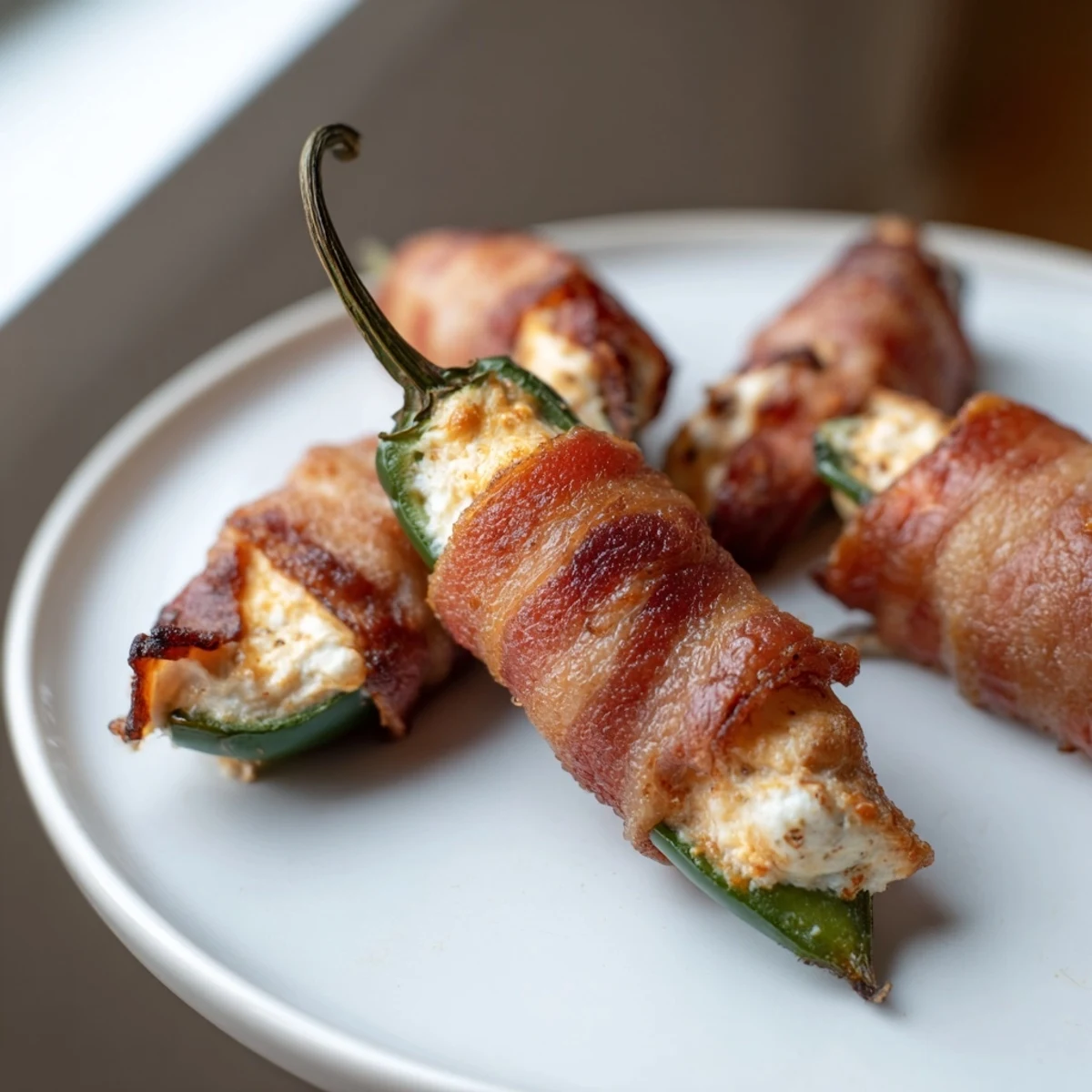 Arrange poppers cheese side up on a lined baking sheet and bake at 200°C (400°F) until bacon is crispy and cheese bubbles, about 18-20 minutes.