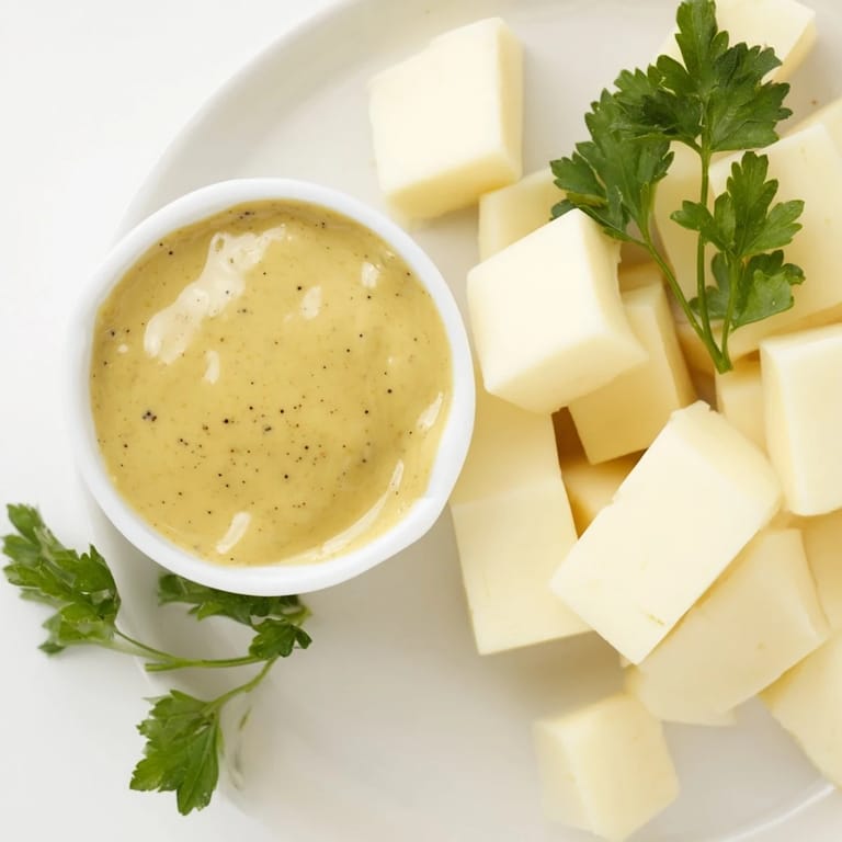 Pin A simple yet elegant cheese platter featuring creamy Gouda cubes paired with a tangy homemade mustard dipβperfect for entertaining or as a sophisticated snack.