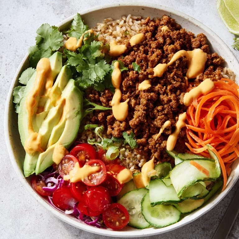 Pin A vibrant, protein-packed bowl featuring plant-based meat alternatives, fresh vegetables, and bold, globally inspired seasonings. Perfect for a satisfying, wholesome meal.