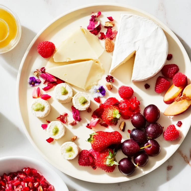 Pin A beautifully arranged platter inspired by the elegance of a rose garden, featuring delicate floral flavors, fresh fruits, artisanal cheeses, and edible flowersβperfect for a romantic picnic or special occasion.