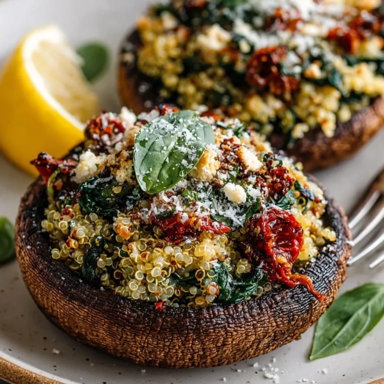 Large portobello mushrooms are filled with a Mediterranean-inspired mixture featuring quinoa, sun-dried tomatoes, baby spinach, crumbled feta, fresh herbs, and toasted pine nuts. The stuffed mushrooms are roasted until the caps become tender and the savory stuffing turns lightly golden. Garnished with basil and lemon, these satisfying mushroom mains deliver bold flavors and plenty of protein while being vegetarian and gluten-free. Perfect for a weeknight meal or serving at a special gathering.
