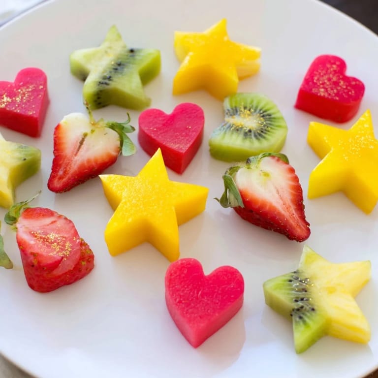 Ensure your fruits are firm and ripe for clean-cut shapes. Using a sharp paring knife to slice fruits evenly helps the cookie cutters create perfect stars and hearts. If you want glittering garnishes, apply edible gold dust gently with a soft brush or sprinkle lightly to avoid clumping.