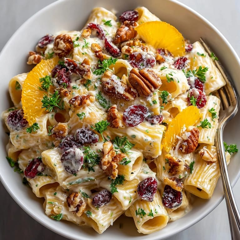The creamy tanginess of this pasta makes it an excellent companion to many holiday favorites. Serve alongside roasted turkey or chicken for a complete meal. For beverages, opt for a crisp white wine like Pinot Grigio or a light Chardonnay that won't overwhelm the delicate balance of flavors. For a non alcoholic option, sparkling water with a splash of cranberry juice and an orange slice echoes the flavors in the dish beautifully. Complete the meal with a simple green salad dressed with a light vinaigrette to cut through the richness of the pasta.