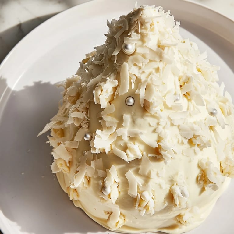 - 12. Before serving, sprinkle generously with shredded coconut for a snowy finish, add white chocolate shavings, and decorate with edible silver pearls or rosemary sprigs as desired.